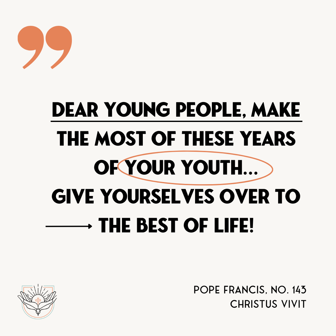 Dove: The open hands also resemble the shape of a dove. A descending dove is a common symbol of the Holy Spirit, as we learn in the Gospel of Matthew, that as Jesus was baptized, “the heavens were opened, and he saw the Spirit of God descending like a dove coming upon him” (Matthew 3:16). The Holy Spirit gathers young adults together in the Church and leads them on a mission, to become sent forth as missionary disciples. "Christ draws near to young people in order to listen to them, teach them, and send them forth, filled with the Holy Spirit to” (USCCB, Listen, Teach, Send) In this way, they can become, “protagonists of the revolution of charity and service.” (Francis, Christus Vivit, no. 174)